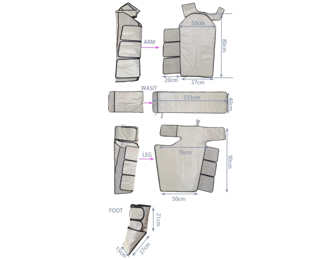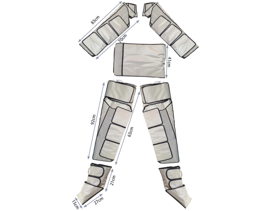 Метод пневмокомпрессии: воздух последовательно нагнетается в 36 независимых камер костюма (ботфорты, пояс, рукава), создавая волну давления от конечностей к центру. Это стимулирует лимфоток, венозное кровообращение, выведение межклеточной жидкости и токсинов, уменьшает отёки и объёмы, борется с целлюлитом.